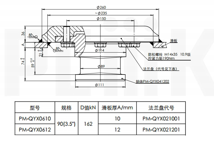 3、8XM14*35為一次性防松螺栓(不得二次使用),性能等級(jí)10.9,擰緊為矩190±10Nm.